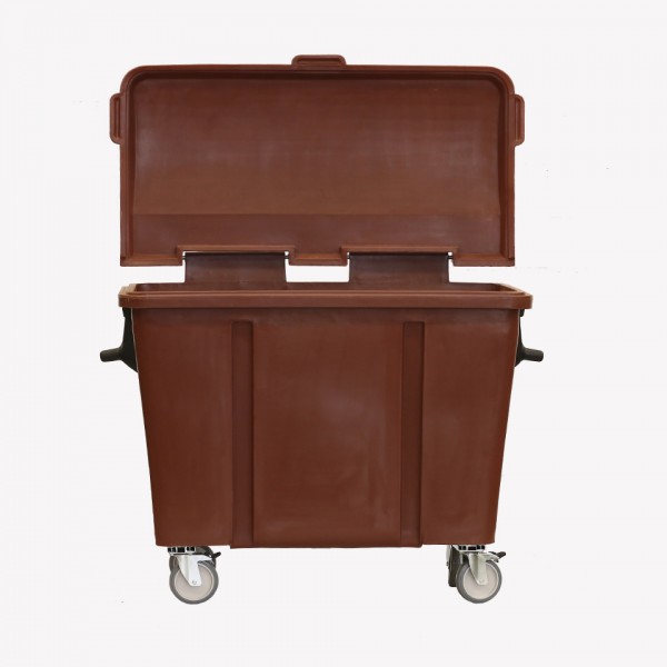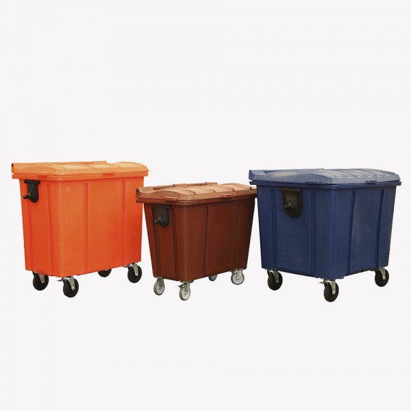 Contam com 04 rodízios giratórios (02 com freios) e garfos em aço com tratamento anti-corrosão. Possui munhão para basculamento lateral em caminhões de coleta urbana, reforço em chapa de aço e dreno com tampa rosqueável para escoamento de líquidos.